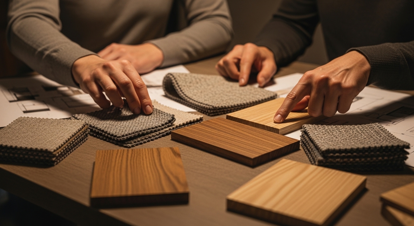 Materiais que têm presença: tecidos e madeiras que harmonizam com o bom gosto — e o uso diário.
